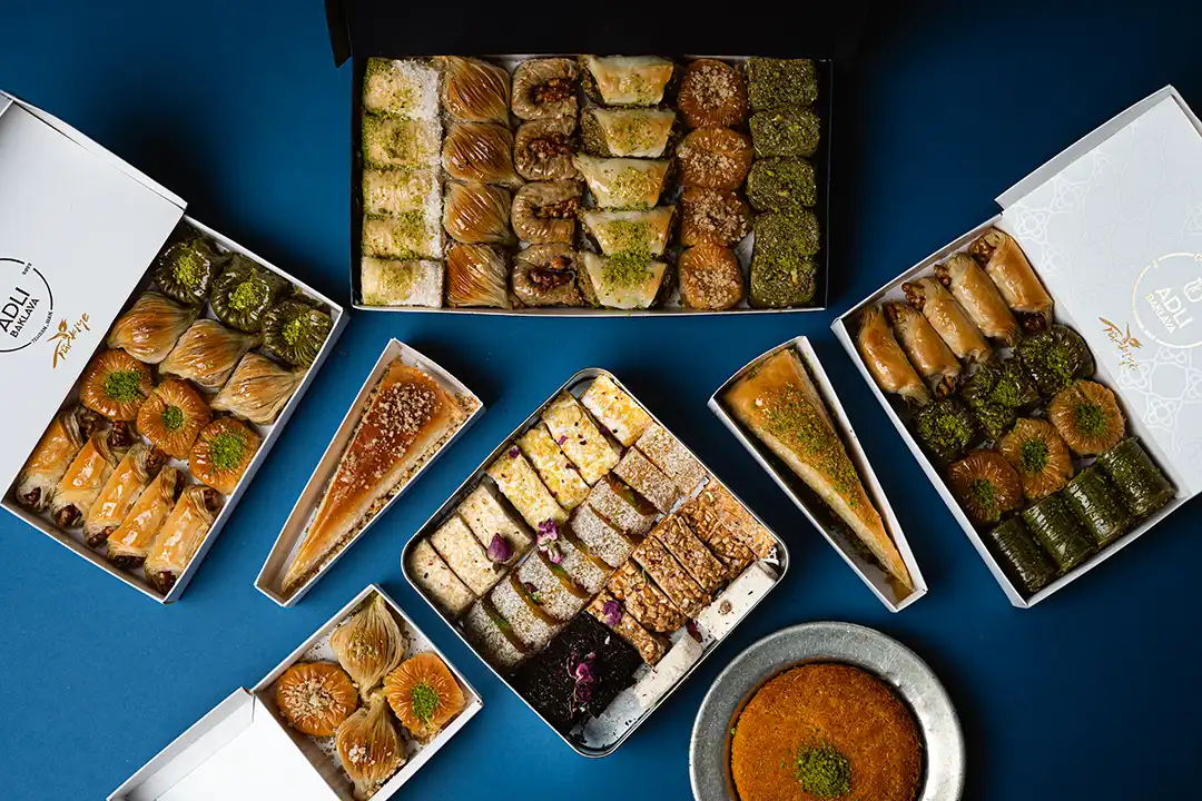 باقلواهای آدلی کافه با خمیرهای چند لایه ترد و حاوی مغز پسته یا گردوی ممتاز ایرانی تهیه میشوند و انواع مختلفی مانند دولانگیر پسته، کادایف پسته، لانه بلبل پسته، میدیه پسته، جیمجیک گردو و غیره را شامل میشوند. همچنین میکسهای باقلوا (پسته، گردو یا ترکیبی) نیز موجود است.